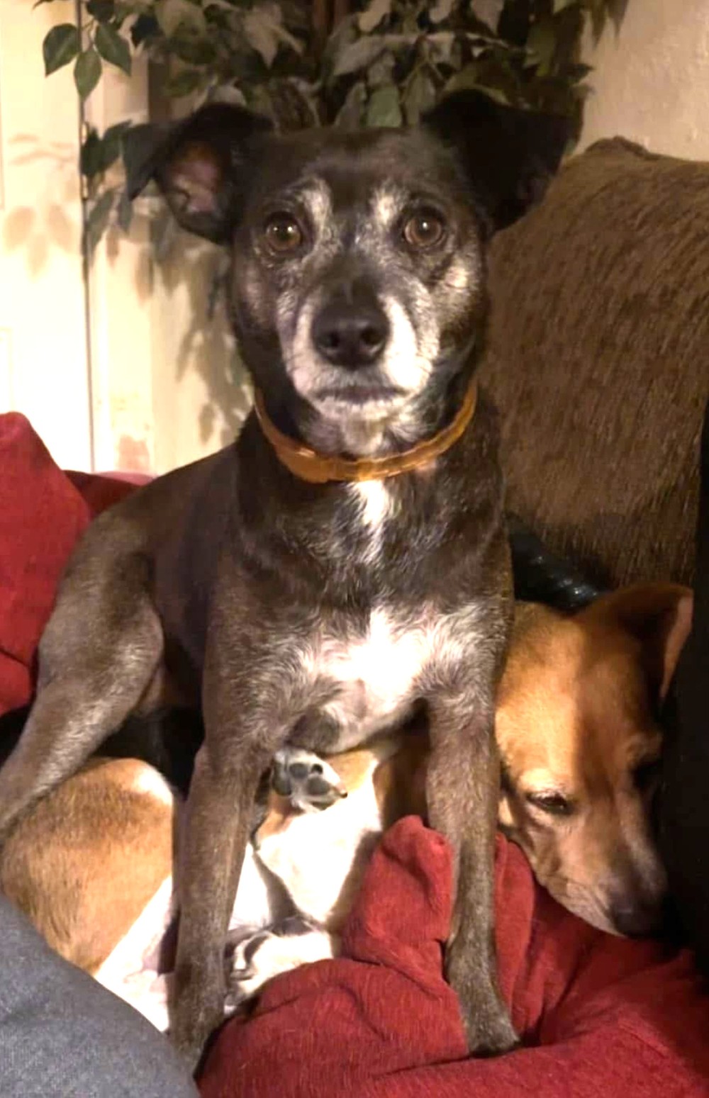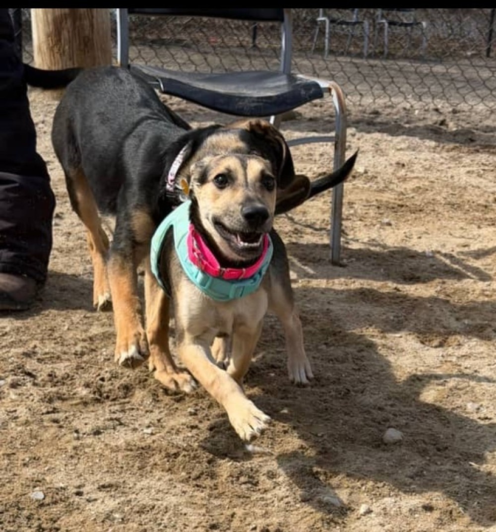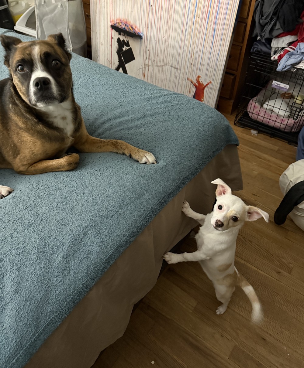 Mina found a wonderful home where she has a big sister named Ollie who is a boxer mix. They play together all day and most nights. They adore one another. Mina and Ollie teamed up to take over their dad's bed. (If he's really good, they'll let him have a little space.) Mina is a small dog with a big personality, but you can probably tell that from the photo.