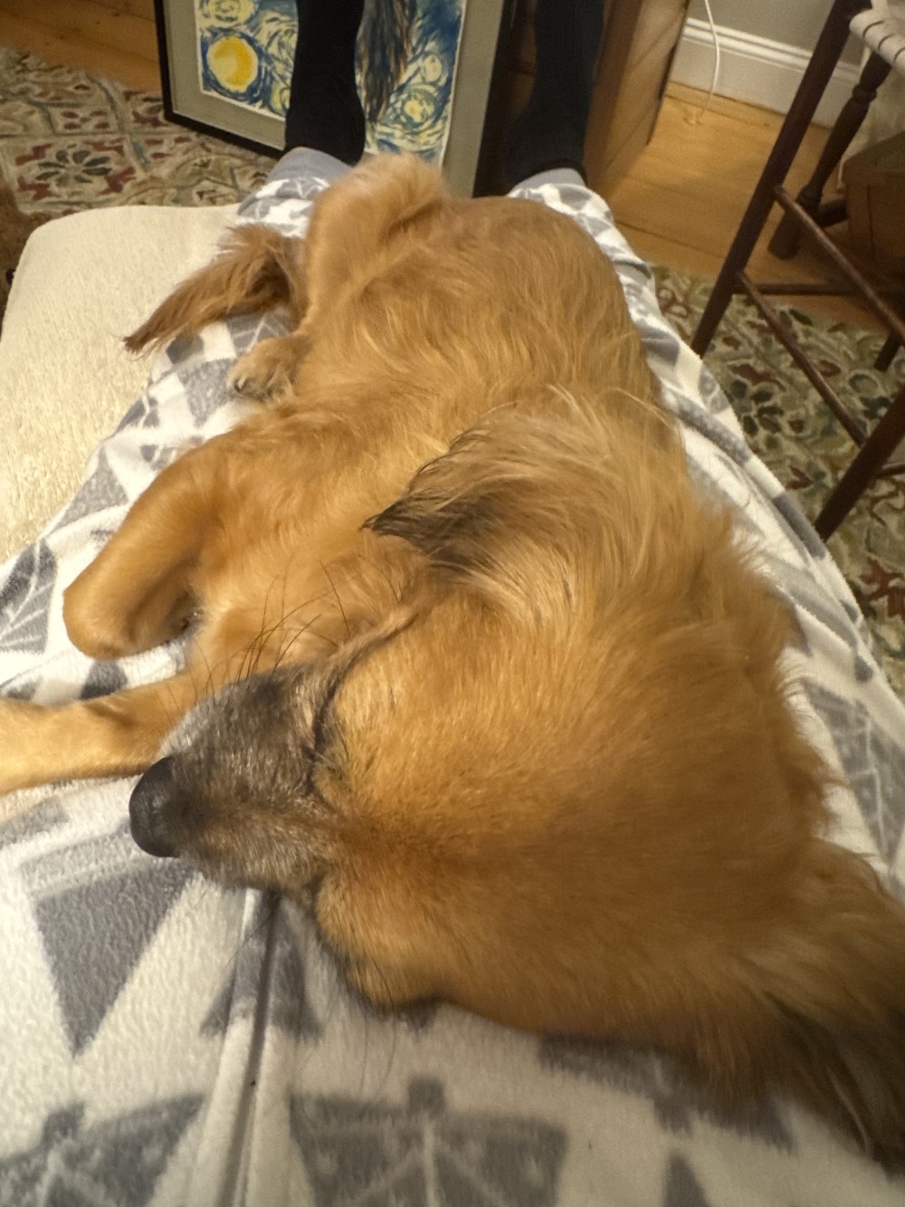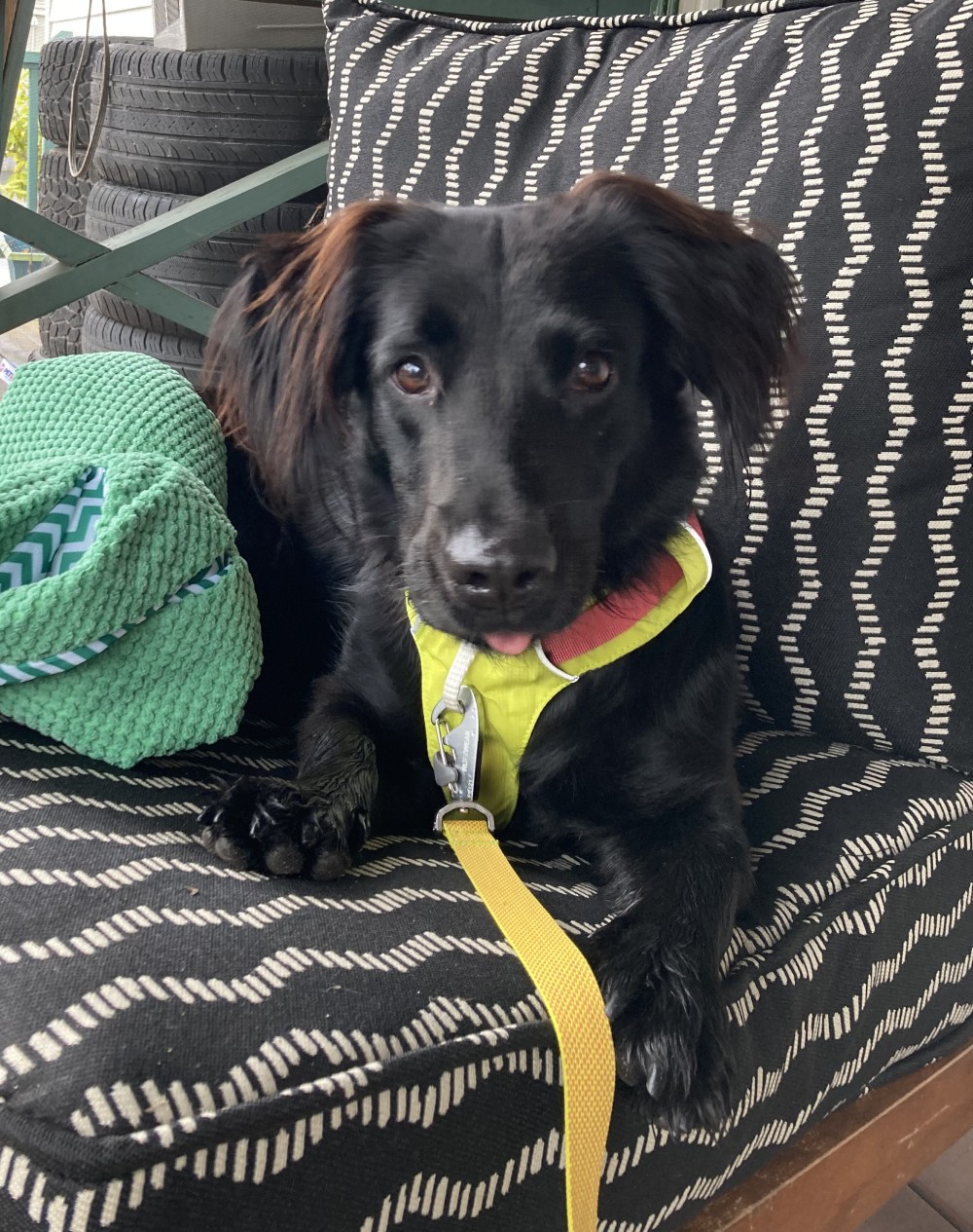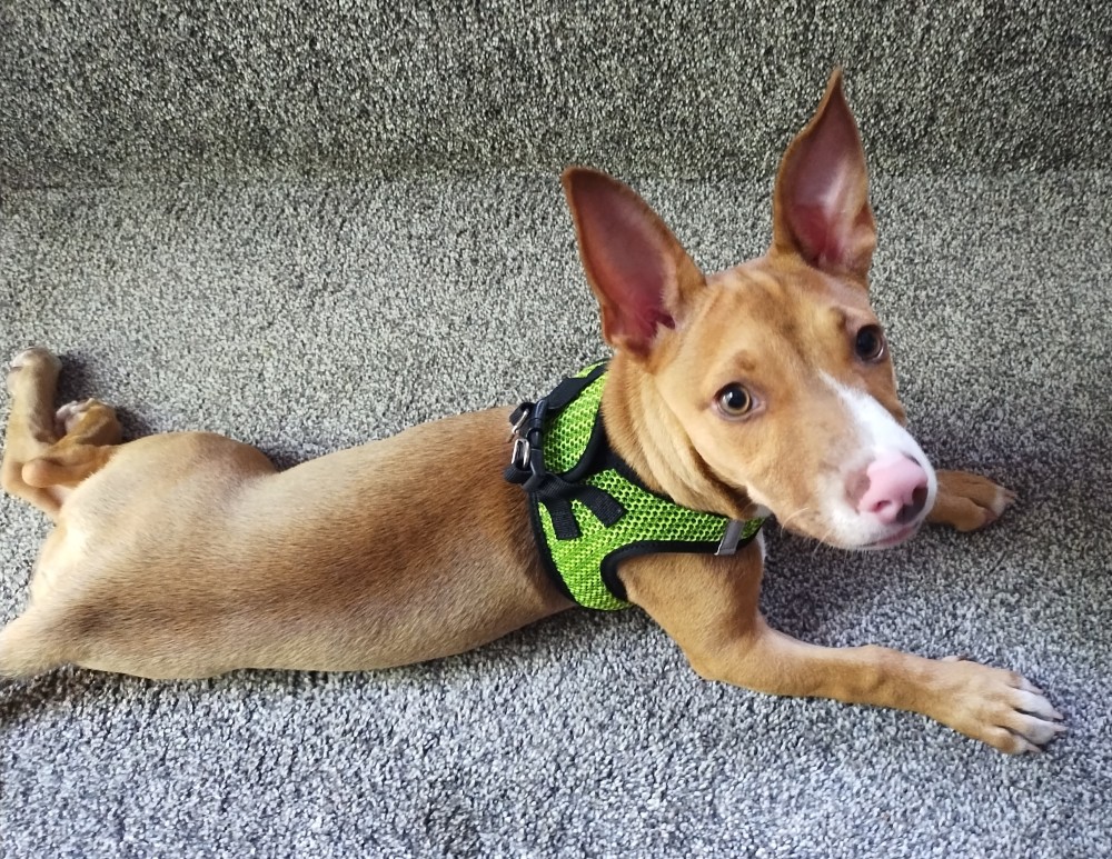 Stella found her wonderful home through our partner Cape Ann Animal Aid in Gloucester, MA. Stella is thriving and super happy to spend lots of time with her new mom and a big brother (feline) named Atticus. She LOVES having a comfy place to stretch out.