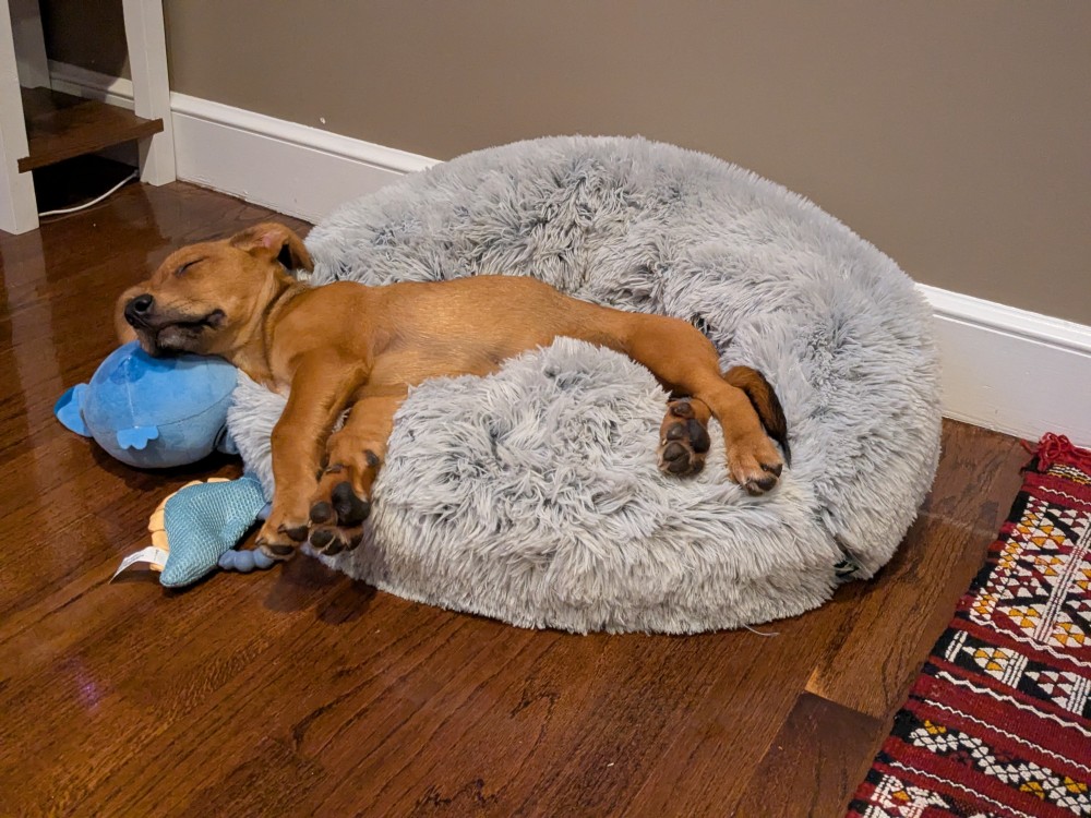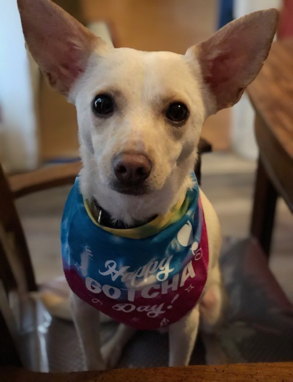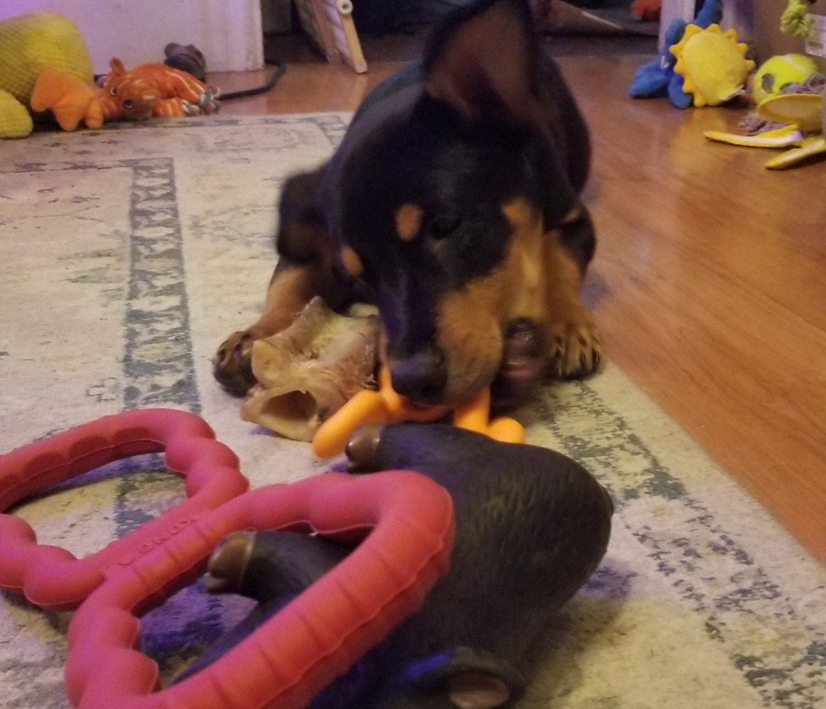 Rubi goes by many names: Rubi-Doo, Rubix-cube and Rubi-con. She found her wonderful family through Cape Ann Animal Aid in Gloucester, MA. She is smart and lovely. She has been having lots of adventures with her new family including trips to the dog park, walks on the beach, homecoming, and hikes with the Boy Scouts. She is loved and treasured. Rubi sleeps in bed with her humans and eats a mixture of homemade dog food and kibble. Her best friend is a pug named Mr. Puddles.